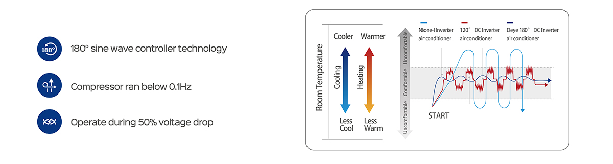 -Deye는 인버터 에어컨을위한 180 ° Sine Wave DC 인버터 컨트롤러 기술을 보유하고 있습니다. "SVPWM"은 압축기를 0.1Hz 미만으로 낮은 주파수로 실행하여 120 DC 인버터 컨트롤러 기술에 비해 DC 압축기의 활용을 13% 향상시킵니다. 비 투입기 에어컨과 비교하여 32% x (특허 번호 : ZL 2009 1 0127633.8).